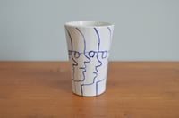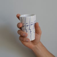 Stoneware fired Coffee cups decorated by hand in cobalt blue. Each cup is a one of a kind, hand crafted and glazed by Benjamin Phillips. They are strong, dishwasher proof and can be used as an everyday drinking vessel or as an ornamental vase/stand alone artwork. Cups 1 - 6 are approximately 10cm tall x 7cm wide cups 7 and 8 are slightly smaller.